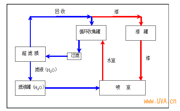 新的分散体系在高度稀释下也很稳定,因此这些产品可用超滤装置回收。在喷涂台内用水帘来收集多余喷涂物。高度稀释的漆被送入一个超滤装置内,它将小分子水从大的聚合物液滴中分离出来。稀释的漆通过这个膜进行循环,直到达到最初的固体含量;最终得到的水过滤液由喷涂台中的水帘带回。循环得到的漆可以不经过进一步的处理直接使用而不需要加入任何添加剂或是光引发剂。